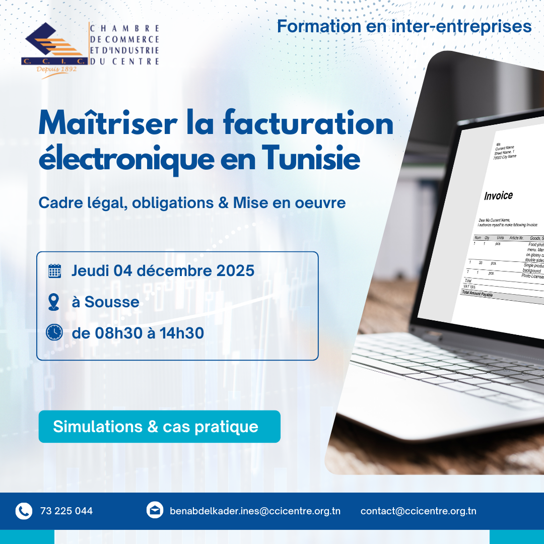 Dans le but de se familiariser avec la plateforme nationale de la facturation électronique et en vue d’appréhender son fonctionnement, la Chambre de commerce et d’Industrie du centre vous invite à participer à la journée de formation pratique programmée pour le jeudi 4 décembre 2025 à Sousse. Au programme : Cadre juridique et fiscal de la facturation électronique en Tunisie- Obligations déclaratives