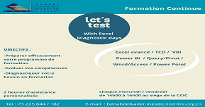 Les journées de diagnostics (Excel diagnostics days) sont considérées comme un critère déterminant au succès du programme de formation étant donnée qu’elles visent à recueillir et étudier vos besoins et attentes personnalisées afin d’établir un « Mini bilan de compétences » relié aux fonctionnalités avancées d’Excel.Ce bilan vous permettra de planifier au mieux les prochains cycles de formation reliés à ce domaine. A cet effet, des sessions d’évaluation des prérequisseront organisées chaque semaine par la Chambre de Commerce et d’Industrie du Centre au profit des entreprises de la région du Centre souhaitant programmer des cycles de formation portant sur les modules suivants :