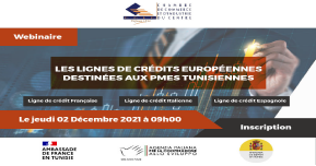 La Chambre de Commerce et d‘Industrie du Centre a organisé en collaboration avec les services économiques de l’Ambassade de France en Tunisie et l’Ambassade d’Espagne en Tunisie ainsi que l’Agence Italienne pour la Coopération au Développement un webinaire sur Les lignes de crédits Européennes destinées aux PMEs tunisiennes (Française-Espagnole-Italienne) le jeudi 02 Décembre 2021. La rencontre, conduite par Mme Faten BASLY, Directeur Général de la CCIC, était l’occasion pour les entreprises participantes et opérant dans divers secteurs d’activité d’en savoir plus sur les lignes de crédit : française, espagnole et Italienne et d’échanger avec les intervenants sur les modalités d’en bénéficier ainsi que les conditions d’éligibilité. Les lignes de crédits : Française, Italienne et Espagnole ont été présentées respectivement par M. Florentin HYVERT, Responsable au Service Economique Régional auprès de l’Ambassade de France en Tunisie, M. Anis KHELIFI, Chargé de Programme Senior Secteur privé auprès de l’Agence Italienne pour la Coopération au Développement-Siège de Tunis et Mme Rosa María GUTIERREZ GARCIA, Attaché Commercial Principal auprès de l’Ambassade du Royaume d’Espagne en Tunisie.