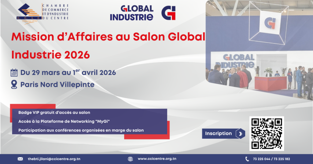 La Chambre de Commerce et d’Industrie du Centre (CCIC) organise une mission d’affaires au Salon Global Industrie 2026et ce du 29 mars au 1eravril 2026 à Paris Nord Villepinte (France).