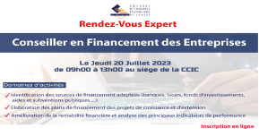 Ces Rendez Vous qui se dérouleront sous forme de consultations individuelles, permettront de répondre aux questions des entreprises relatives à : -Identification des sources de financement adaptées (banques, Sicars, fonds d’investissements, aides et subventions publiques…) -Elaboration des plans de financement des projets de croissance et d’extension -Amélioration de la rentabilité financière et analyse des principaux indicateurs de performance Cette séance de consultation sera assurée par un éminent expert spécialisé en Financement des entreprises qui apportera l’appui et le conseil personnalisé aux entreprises dans leurs démarches pour financer le développement de leurs activités (nouveaux marchés, exportation, innovation, …) Nous vous invitons à vous inscrire en ligne ou à remplir la fiche ci-jointe et la retourner à la CCIC par e-mails : moujbany.mourad@ccicentre.org.tn / elatri.rim@ccientre.org.tn et ce avant le 18 Juillet 2023. En cas de besoin, n’hésitez pas à nous contacter par Tél : 73.225.044/73.225.182
