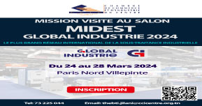 mission visite au Salon MIDEST - Global Industrie 2024 et ce du 24 au 28 Mars 2024 à Paris Nord Villepinte. Avec plus de 2 300 exposants et plus de 40 000 visiteurs attendus pour l'édition 2024, Global Industrie est le rendez-vous incontournable de la sous-traitance et des perspectives industrielles.C’est l’occasion exceptionnelle de découvrir les dernières innovations et de s'engager dans l'industrie du futur.